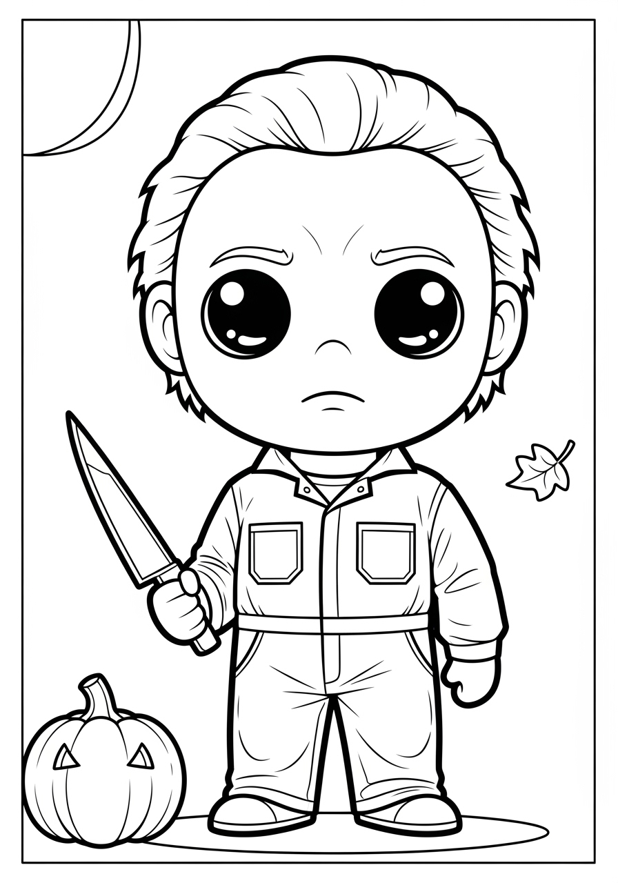 Immerse yourself in the eerie charm of our Halloween coloring page featuring Michael Myers. This detailed line art illustration offers a perfect blend of spooky and festive elements that will captivate adult coloring enthusiasts. The iconic masked character stands at the center, exuding a chilling presence with his classic, slightly worn jumpsuit and a large, ornate knife held at chest level. The backdrop showcases a haunted house surrounded by twisted trees, setting a perfect Halloween scene. Scattered autumn leaves and carved jack-o'-lanterns add a touch of festivity to this haunting artwork.