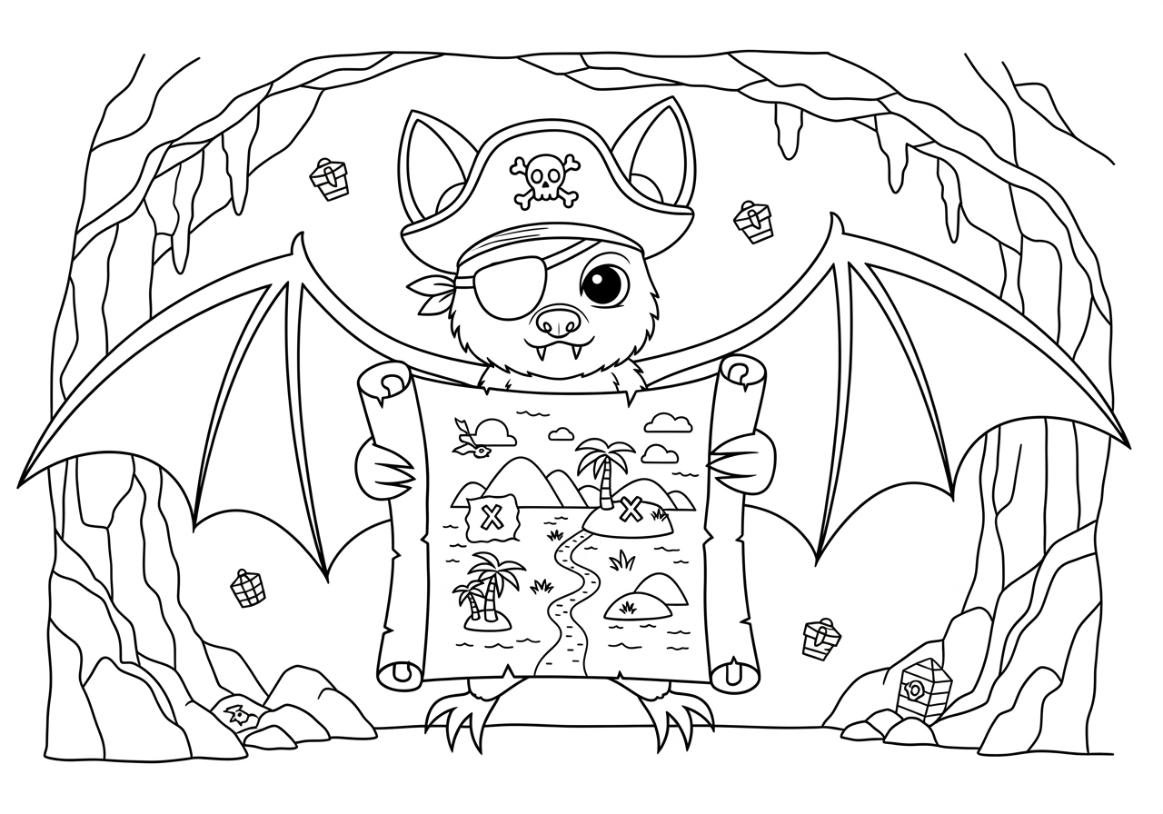 Pirate Bat with a Treasure Map Coloring Page